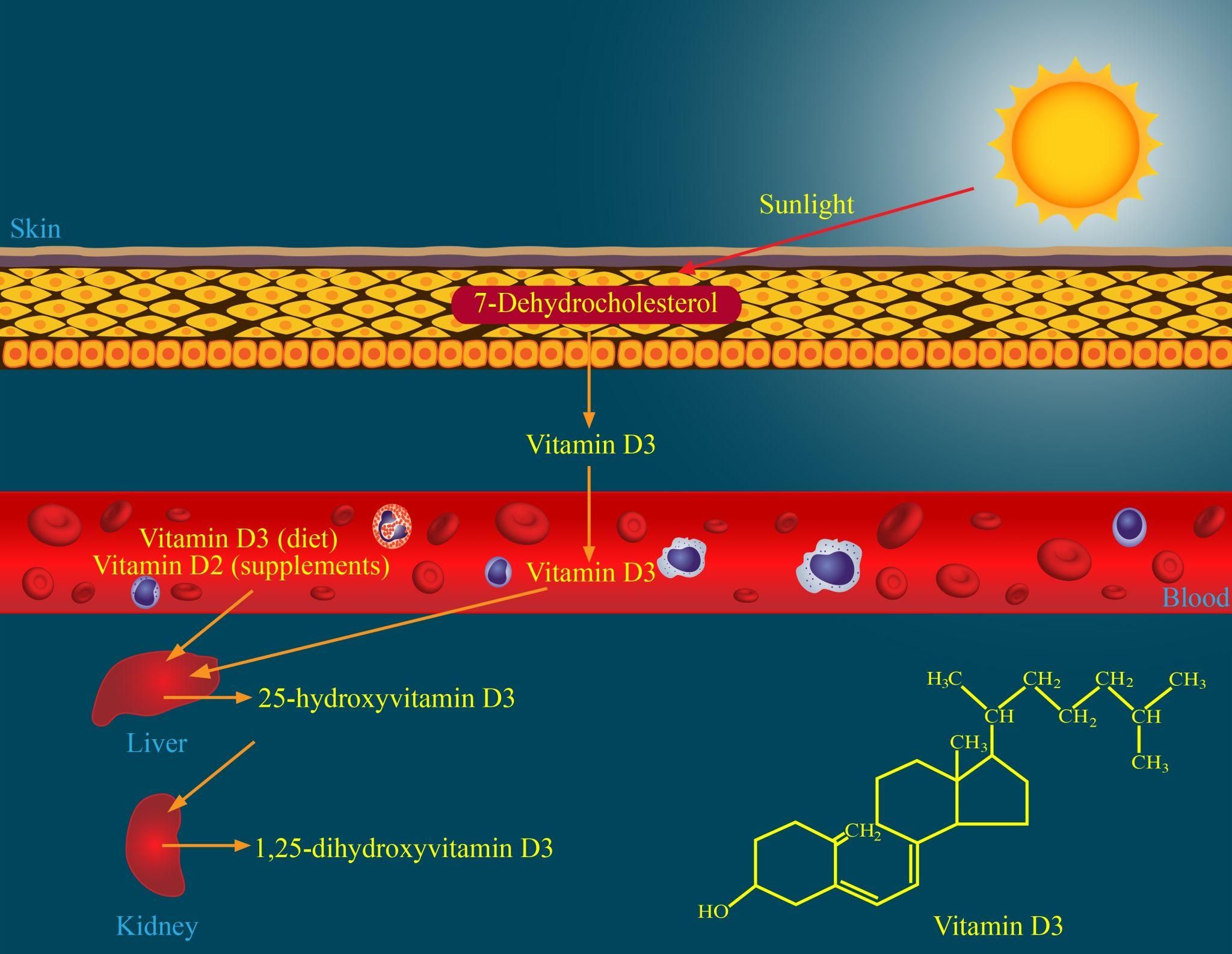 From the skin, vitamin D3 enters the bloodstream and travels to the liver, where it is converted into a storage form known as 25-hydroxyvitamin D. The process continues in the kidneys, which convert it into its fully active hormonal form called calcitriol. At this point vitamin D becomes a powerful signaling molecule that travels throughout the body and influences many biological systems.
